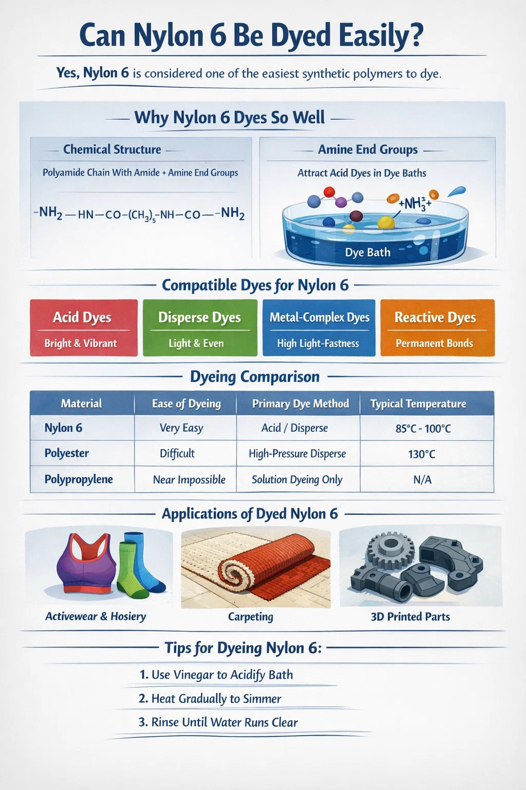 ใช่ ไนลอน 6 ถือเป็นหนึ่งในโพลีเมอร์สังเคราะห์ที่ง่ายที่สุดในการย้อม โดยเฉพาะอย่างยิ่งเมื่อเปรียบเทียบกับพลาสติกชนิดอื่น เช่น โพลีเอสเตอร์หรือโพลีโพรพีลีน โครงสร้างทางเคมีที่เป็นเอกลักษณ์ประกอบด้วยตำแหน่งที่เกิดปฏิกิริยาจำนวนมากซึ่งช่วยให้โมเลกุลของสีย้อมสร้างพันธะถาวรที่แข็งแกร่ง ความสัมพันธ์ที่สูงกับสารสีทำให้ไนลอน 6 สามารถทำได้ เฉดสีที่สดใส ลึก และความคงทนของสีที่ยอดเยี่ยม โดยใช้กระบวนการย้อมด้วยน้ำมาตรฐานที่อุณหภูมิค่อนข้างต่ำ