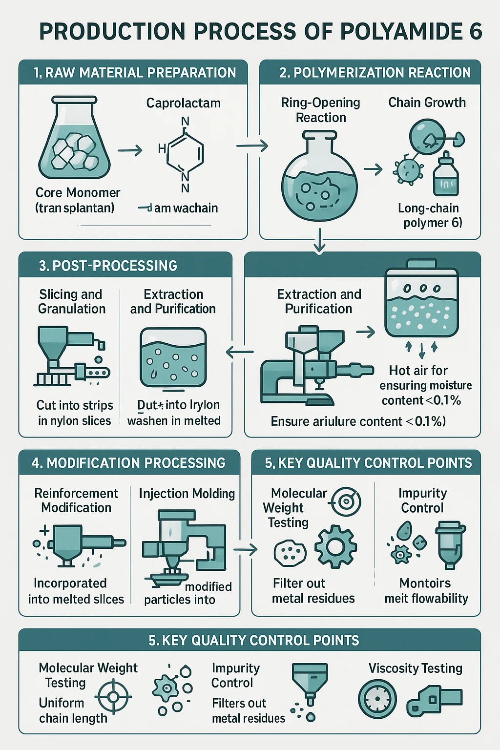 Core Monomer: Caprolactam (ผลึกใส) ผลิตจากเบนซีนที่สกัดจากปิโตรเลียมโดยผ่านปฏิกิริยาหลายขั้นตอน