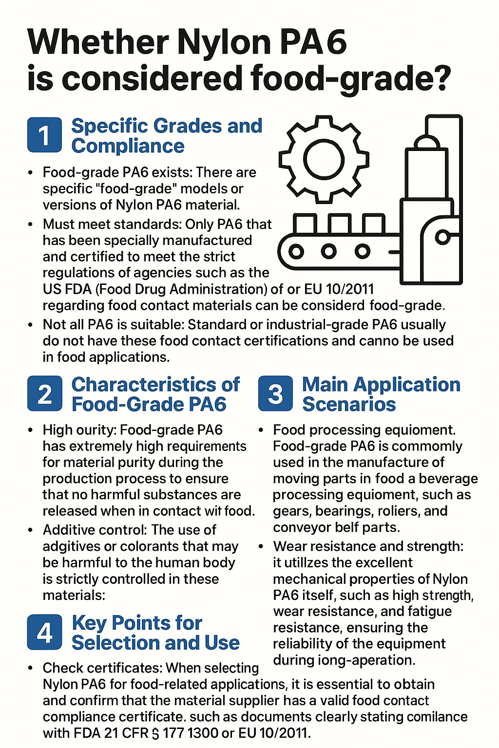 ต้องเป็นไปตามมาตรฐาน: เฉพาะ PA6 ที่ผลิตขึ้นเป็นพิเศษและได้รับการรับรองตามกฎระเบียบที่เข้มงวดของหน่วยงานต่างๆ เช่น US FDA (สำนักงานคณะกรรมการอาหารและยา) หรือ EU 10/2011 ที่เกี่ยวข้องกับวัสดุสัมผัสกับอาหารเท่านั้นที่สามารถถือเป็นเกรดอาหารได้