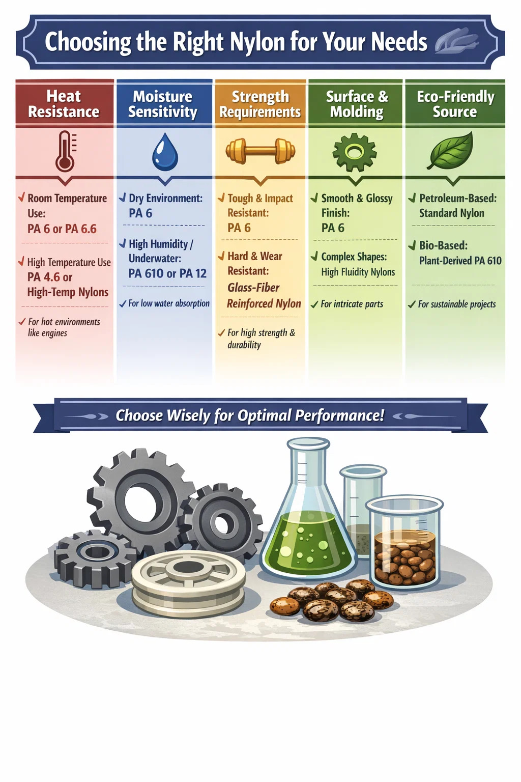 การใช้งานทั่วไปในครัวเรือนหรืออุตสาหกรรมทั่วไป: หากชิ้นส่วนใช้งานได้เฉพาะที่อุณหภูมิห้องหรือในสภาพแวดล้อมที่ไม่รุนแรง ให้เป็นแบบคลาสสิก โพลีเอไมด์ 6 หรือ PA 6.6 ก็เพียงพอแล้ว มีความคุ้มค่าและสามารถรับมือกับสถานการณ์ในชีวิตประจำวันได้เกือบทั้งหมด