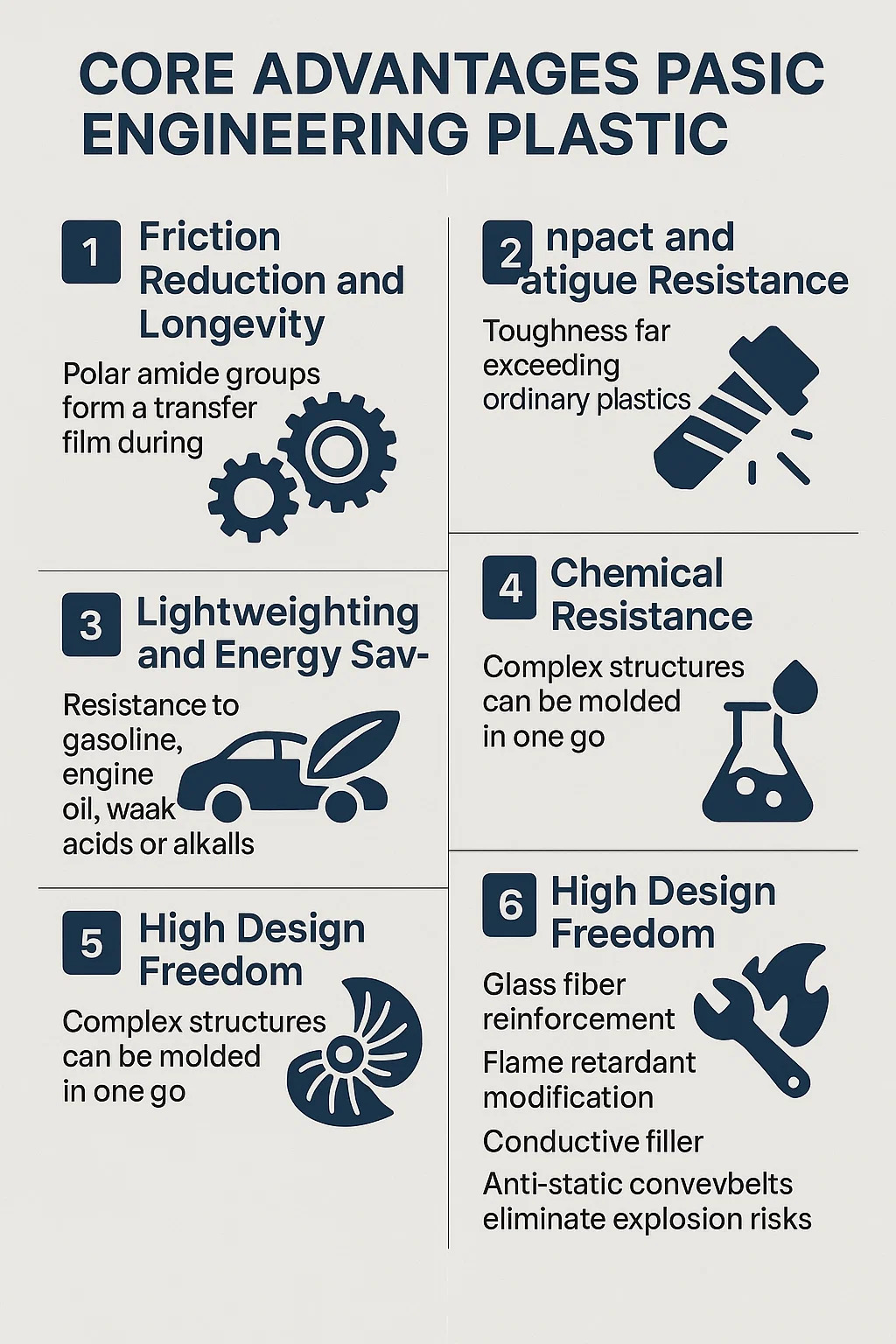 ห่วงโซ่โมเลกุลมีกลุ่มเอไมด์ขั้วโลกซึ่งเป็นฟิล์มถ่ายโอนในระหว่างการเสียดสีช่วยให้เกียร์และแบริ่งทำงานเป็นระยะเวลานานโดยไม่จำเป็นต้องใช้จาระบีภายนอก เมื่อเทียบกับส่วนประกอบการส่งสัญญาณโลหะเสียงจะลดลงมากกว่า 30% และอายุการใช้งานจะขยายออกไปห้าครั้ง