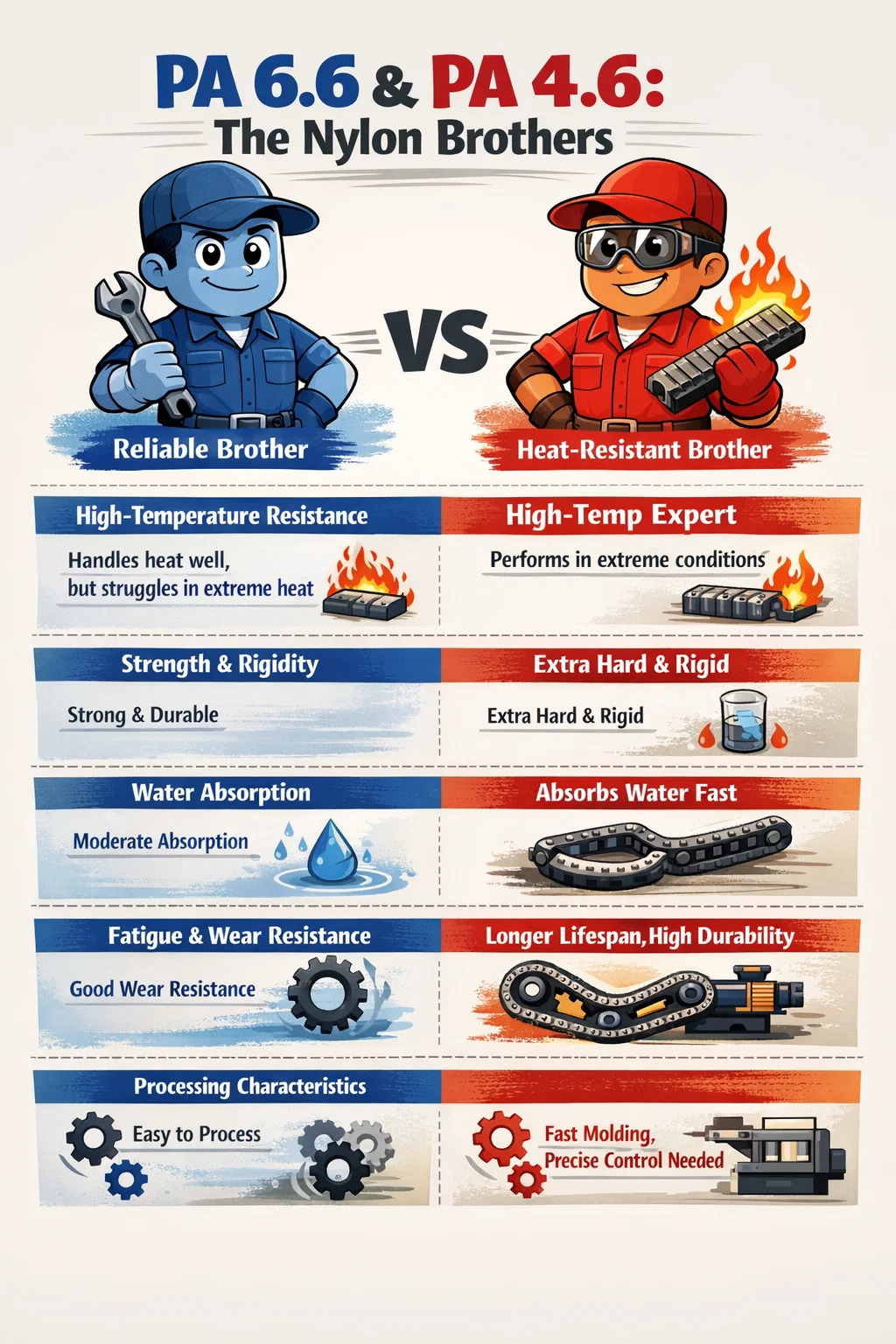 ในตระกูลไนลอน PA 6.6 และ PA 4.6 เปรียบเสมือนพี่น้องสองคนที่มีรูปลักษณ์คล้ายกัน แต่มีบุคลิกและความสามารถที่แตกต่างกัน ทั้งสองอยู่ในตระกูลโพลีเอไมด์ แต่มีประสิทธิภาพแตกต่างกันมากเมื่อต้องรับมือกับอุณหภูมิสูงและการใช้งานที่มีความเครียดสูง