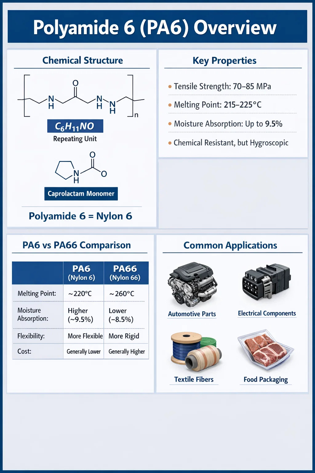 PA6 ย่อมาจาก โพลีเอไมด์ 6 ซึ่งเป็นพอลิเมอร์เทอร์โมพลาสติกกึ่งผลึกที่ผลิตโดยปฏิกิริยาพอลิเมอไรเซชันแบบเปิดวงแหวนของคาโปรแลคตัม อยู่ในกลุ่มไนลอนที่กว้างขึ้นและเป็นหนึ่งในพลาสติกวิศวกรรมที่ใช้กันอย่างแพร่หลายมากที่สุดในโลก "6" หมายถึงอะตอมของคาร์บอน 6 อะตอมในหน่วยโมโนเมอร์ที่ทำซ้ำได้มาจากคาโปรแลคตัม (C₆H₁₁NO) PA6 มักเรียกกันว่า Nylon 6 และทั้งสองคำนี้อธิบายถึงวัสดุฐานเดียวกัน