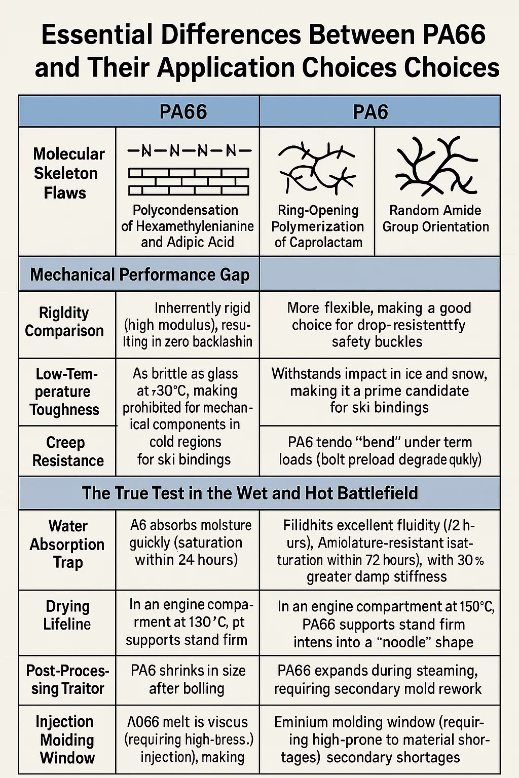 ความเหนียวอุณหภูมิต่ำ: PA66 มีความเปราะบางเท่ากับแก้วที่ -30 ° C ทำให้เป็นสิ่งต้องห้ามสำหรับส่วนประกอบเชิงกลในพื้นที่เย็น PA6 ทนต่อผลกระทบแม้ในน้ำแข็งและหิมะทำให้เป็นผู้สมัครที่สำคัญสำหรับการผูกสกี
